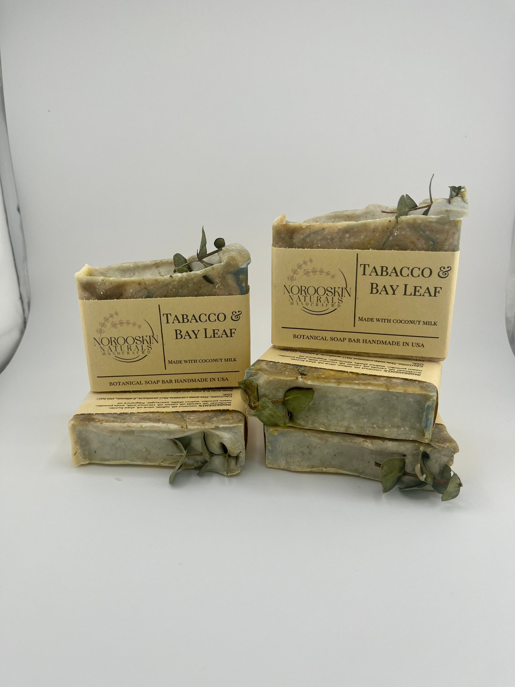 Earthy, fresh, and warm our Tobacco & Bay Leaf Natural Handmade Soap this scent opens up the rich smoky aroma of cured tobacco and the herbal brightness of bay leaf making a timeless blend that's both rugged and natural.